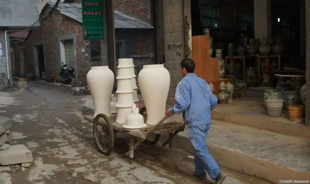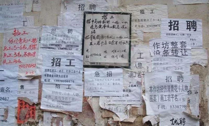 “包老不包真,包旧不包真”这是樊家井每一家瓷器店铺所遵循的道理,也就是说,一切都是公开的,一切都不回避顾客,这是他们的原则。在很多店铺门口,都摆放着盛满泥浆水,是用来涂抹瓷器的,用来做旧,或者用来蚀褪瓷器光鲜的氢氟酸和高锰酸钾,以及用来擦拭瓷器的使其变得陈旧的稻草和草木灰等等。他们透明不避讳,有时候做的是自己的瓷器,有时候也会接一些匠人们的瓷器,整个一樊家井,其实随处看见把瓷器做旧的广告,或者代为匠人加工的字眼,或者是店铺与匠人们合作,承接各种瓷器,因此过道里面也不乏各种招工的公告。这些都屡见不鲜。