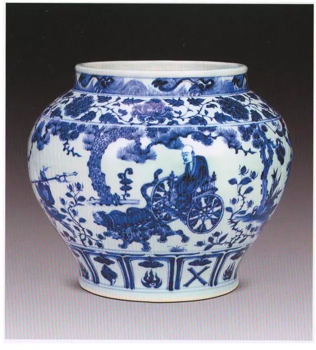 • 主题纹饰描绘了孙膑的师傅鬼谷子在齐国时节苏代的再三请求下,答应下山搭救齐国孙膑和独孤陈的故事。鬼谷子端坐在由一虎一豹牵拉的车舆之上,身体微微前倾,神态自若,超凡如仙,表现出运筹帷幄之中、决胜千里之外的神态。车前两名步卒手持长矛开道,一将士高擎“鬼谷”战旗纵马前行,苏代策马殿后。画面缀以山石树林,一行人逶迤期间,主次分明,疏密有致,气韵流畅,浑然一体,堪称一幅十分完美的人物山水图卷。实为元青花瓷的绝美佳作。