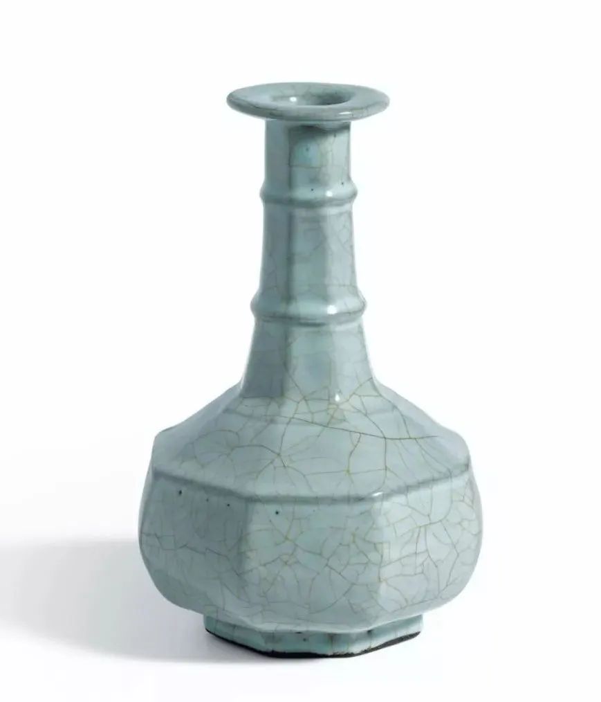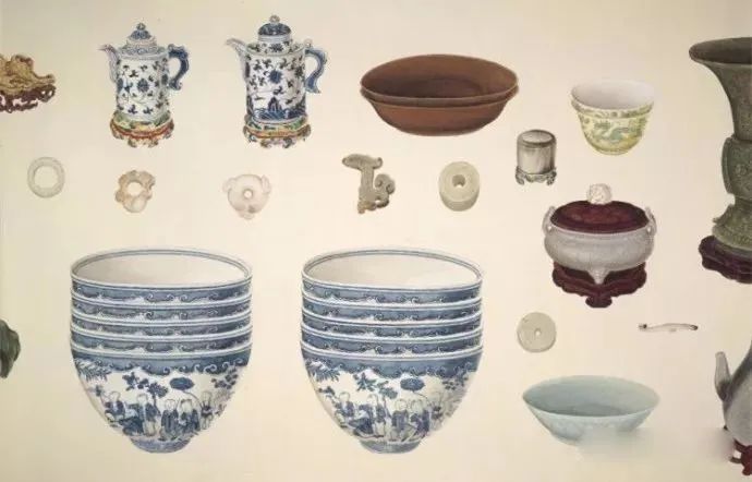 明,杜堇,《玩古图》。此图描绘风雅的主人,在庭院里款待客人鉴赏文玩的情景。这里可以看到主人和客人之间的桌上放满了铜钟、铜鼎、铜壶以及青瓷烛台、香炉、碗、洗一类器物。