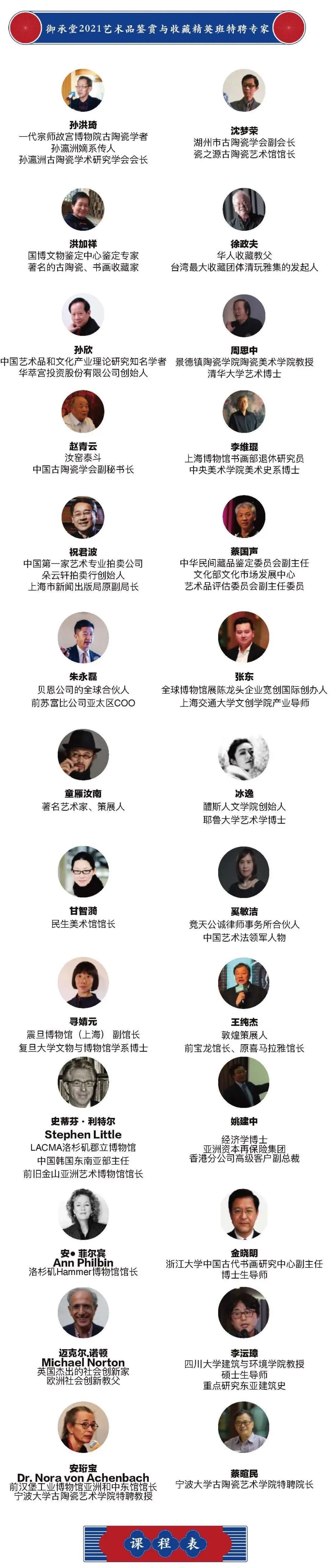《御承堂2021艺术品鉴赏与收藏精英班》邀请到全球各领域的专家,依托强大的专业师资团队,涵盖艺术,资本,国际,收藏各界,集结博物馆,高校,投行,企业等资源,帮助收藏爱好者从初级入门进阶成精通鉴赏、策展、艺术品商业运营及收藏代际传承的资深艺术品收藏家。
