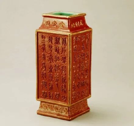 清道光 珊瑚红釉凸贴篆文描金方瓶