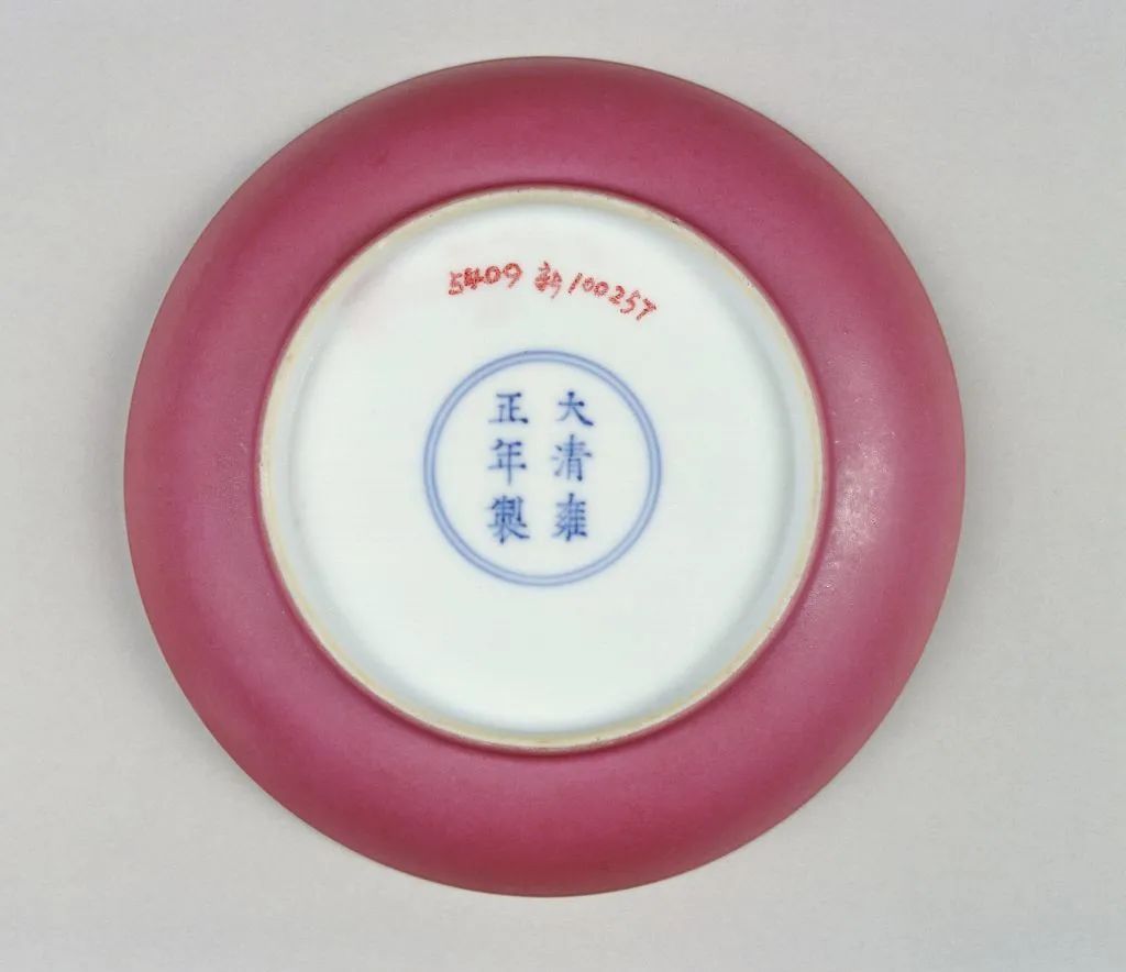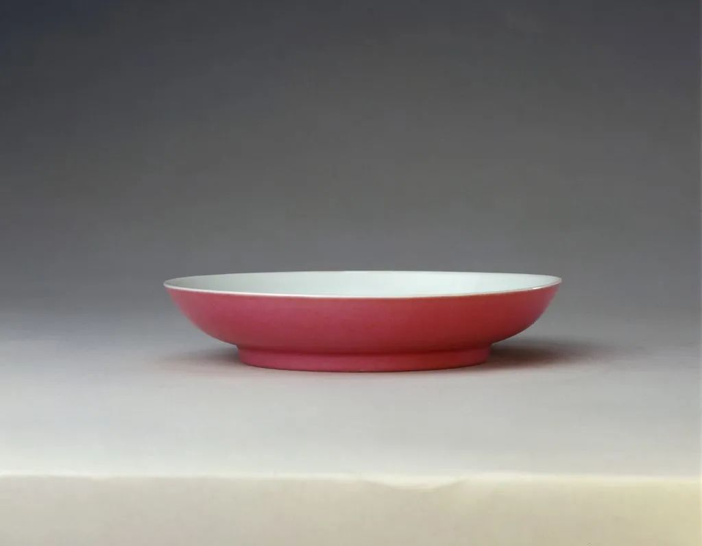 珊瑚红釉始于康熙时期,以铁为着色剂,将配好的釉料吹于细白瓷器上经低温烧成,釉色光润,呈色红中微闪黄,近似天然珊瑚之色。到雍正、乾隆时期珊瑚红釉更为盛行,雍正时釉色闪黄,乾隆时则颜色深而釉层厚。