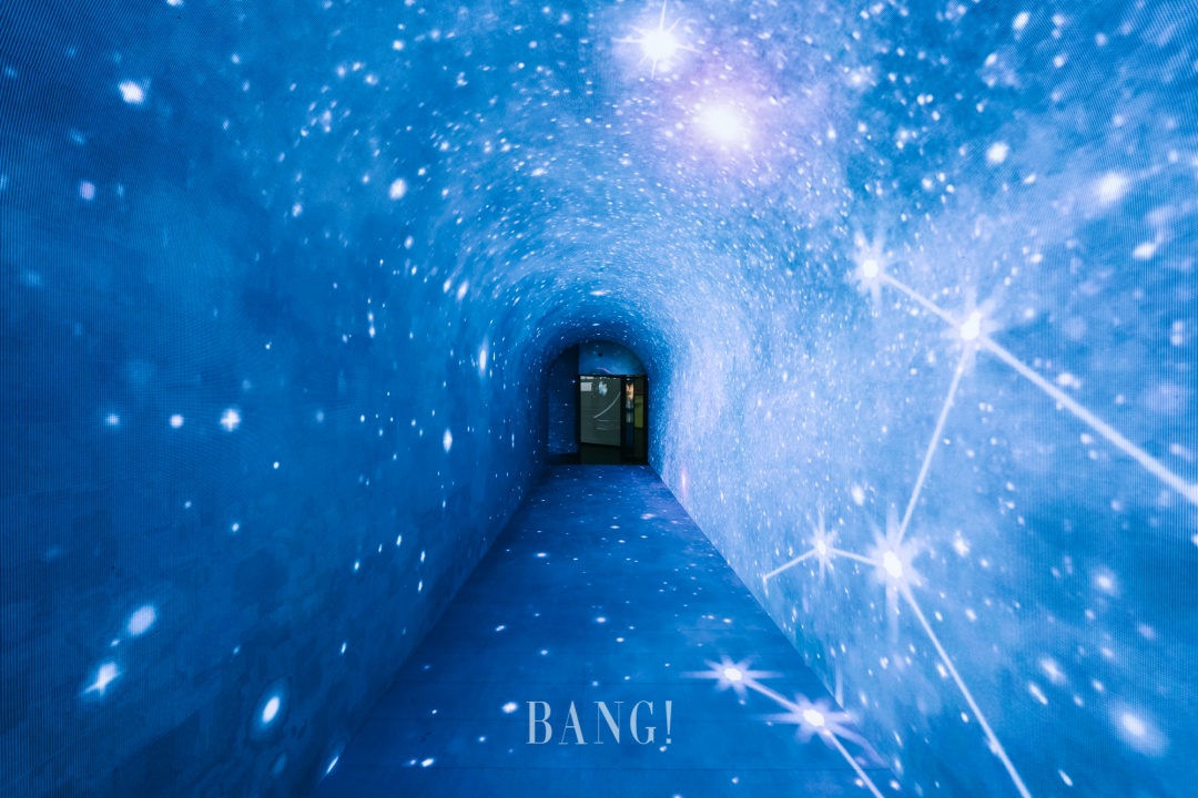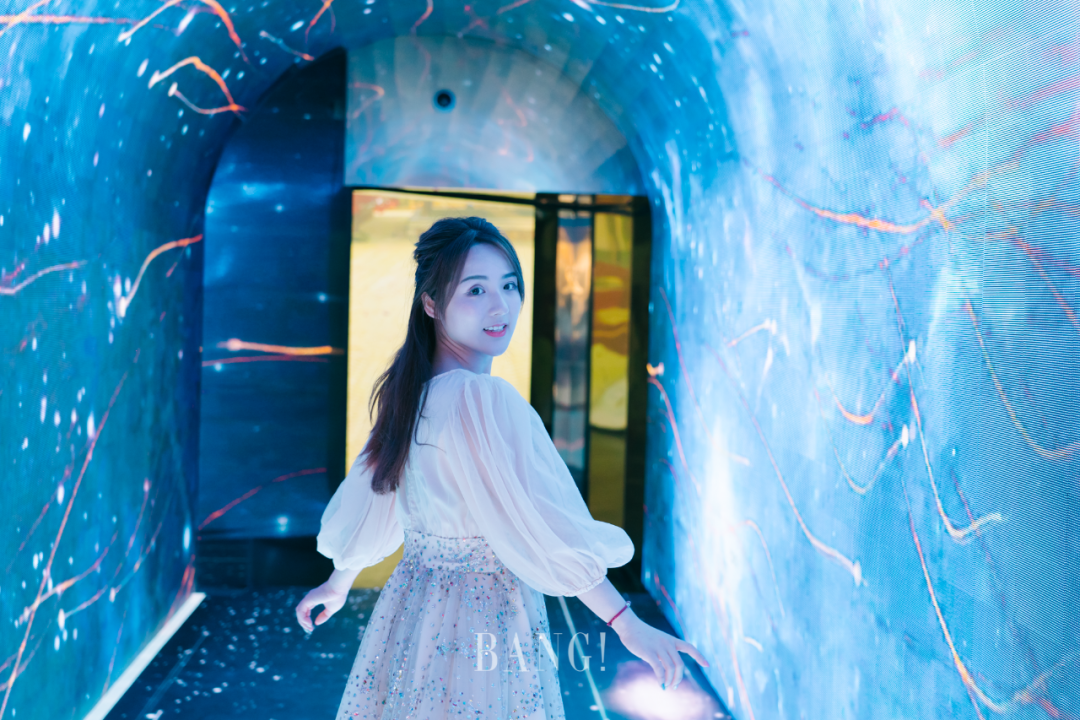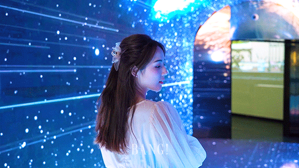 从展馆入口进入,眼前是一条星光闪闪的时空隧道,壮观绚丽的蓝色光影与交织,折射出来耀眼夺目的光芒,花瓣在光影间翩翩起舞,仿佛徜徉在璀璨的银河世界!