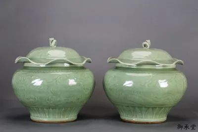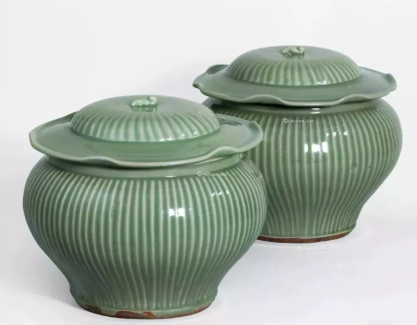 元 龙泉窑百条纹荷叶盖罐 (一对)