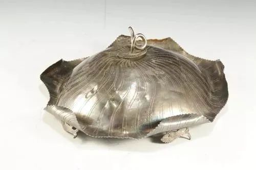 镇江市丁卯桥唐代窖藏出土了一件银质荷叶形罐盖,盖呈卷边荷叶形,写实风格较强,荷叶的蒂、茎、叶脉都一一表现,錾刻工艺精细,线条流畅细密。通高7.3厘米,口径20.6厘米。卷边荷叶形。顶饰柿蒂状钮,盖面錾刻双曲线,边口悬鱼四尾。内边刻“力士”二字。该器写实风格较强,荷叶的茎、叶脉都十分逼真,錾刻工艺精细,线条流畅且疏密有致。