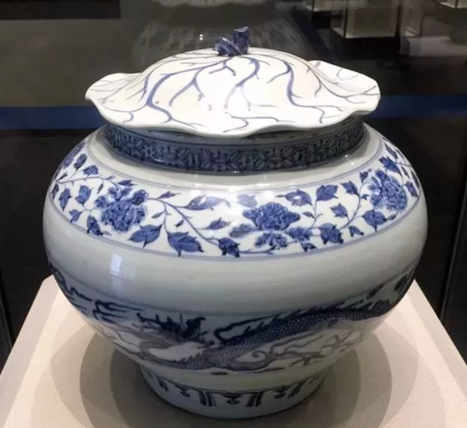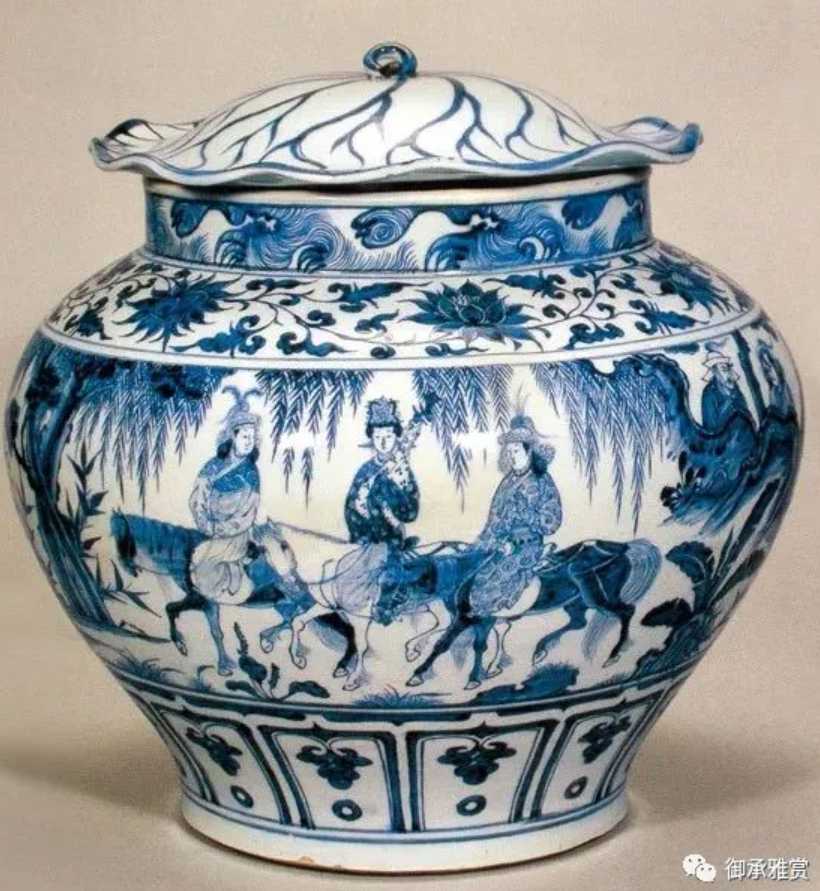 瓷质荷叶形盖罐始见于河南辉县梅溪北宋墓,到元代时南北各窑都有生产,荷叶盖罐成为了那个年代瓷器的流行单品,当年尤其盛行元青花,于是出现了各种元青花的荷叶盖罐。