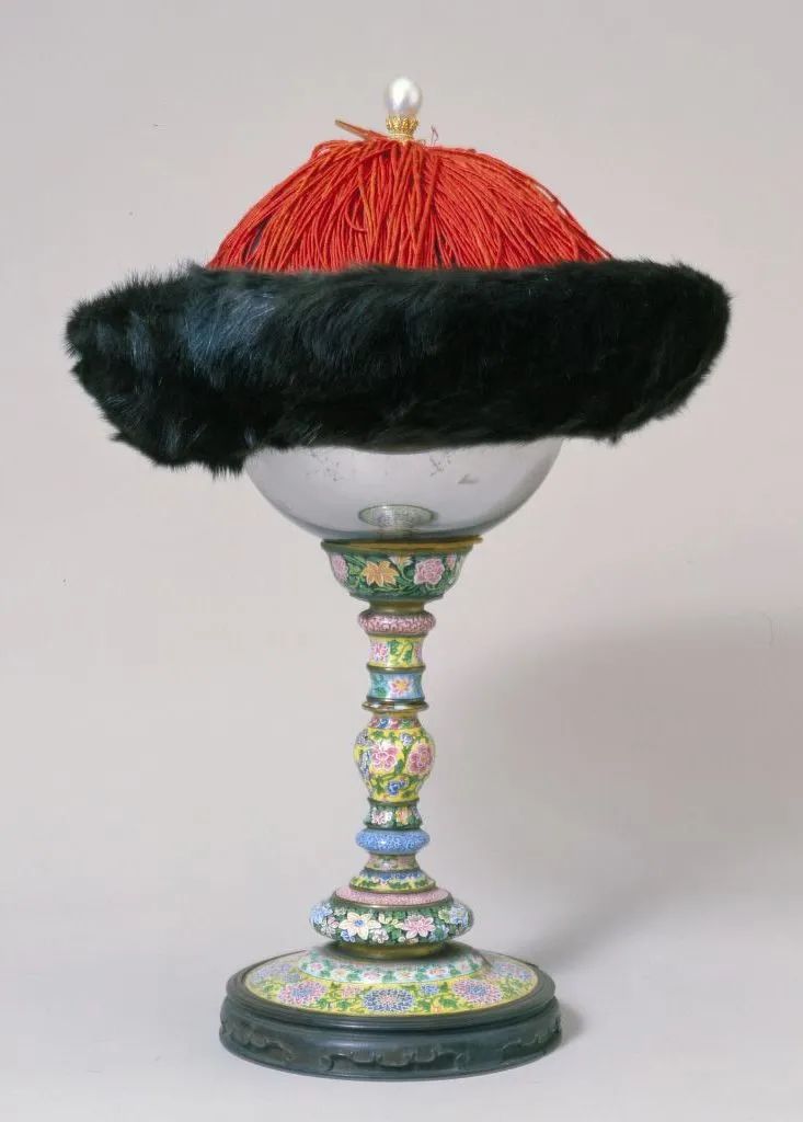 即使并非身上之物,帽架的设计依旧繁复艳丽,不仅是一件精巧的摆设,也展现了奢华的皇家气息。据史料记载,雍正三年十月,造办处收到皇帝的旨义:“库内收的圆玻璃球配合做帽架用”。皇帝亲自过问,可见帽架地位不凡。