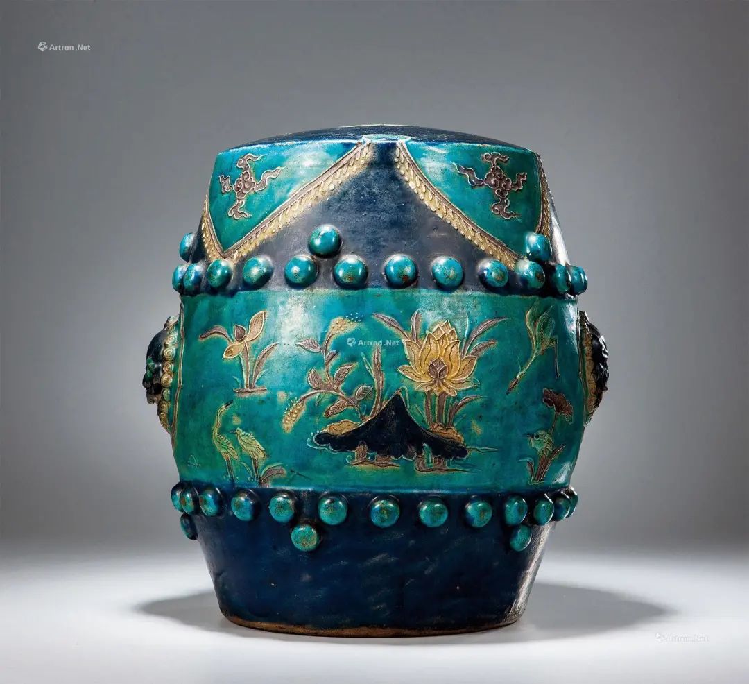 下:明中期 法华彩“一鹭连科”图鼓钉绣墩