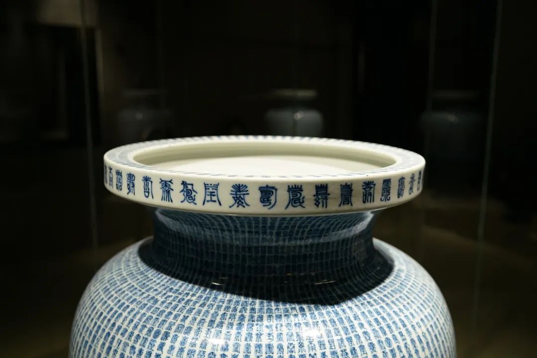 据清宫档案记载:此青花万寿尊是郎廷极在康熙44年至51年烧造的,前后一共研发了七年,其中最为费心费力的是将一个寿字演变成一万个不同的形态,这是一项非常耗神费力的工程,除了笔法的变化之外更要注重它的形状美,全部演变成了,还要将这一万个字布局在整个大罐上,除了布局均匀更要考虑整体的美,字与字之间的贯气,行与行之间的照应,整体的疏密有致,尊体上的字分布在口、沿、身、足四个部分:
